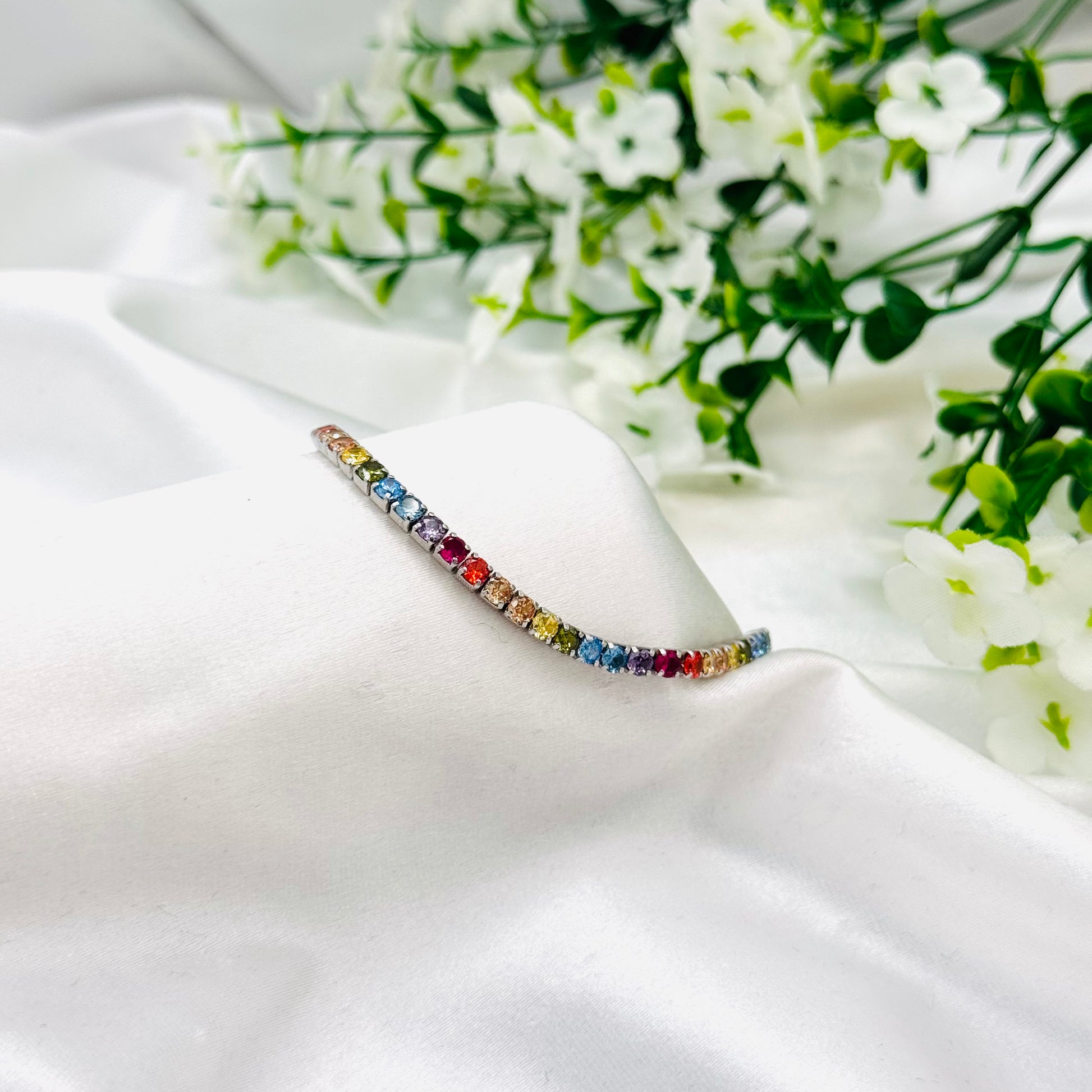 This multicoloured tennis bracelet in 925 sterling silver offers a graceful blend of vibrant hues set against a sleek silver backdrop. Its elegant design adds a subtle yet striking touch of color, making it a versatile accessory for both sophisticated daywear and refined evening looks.