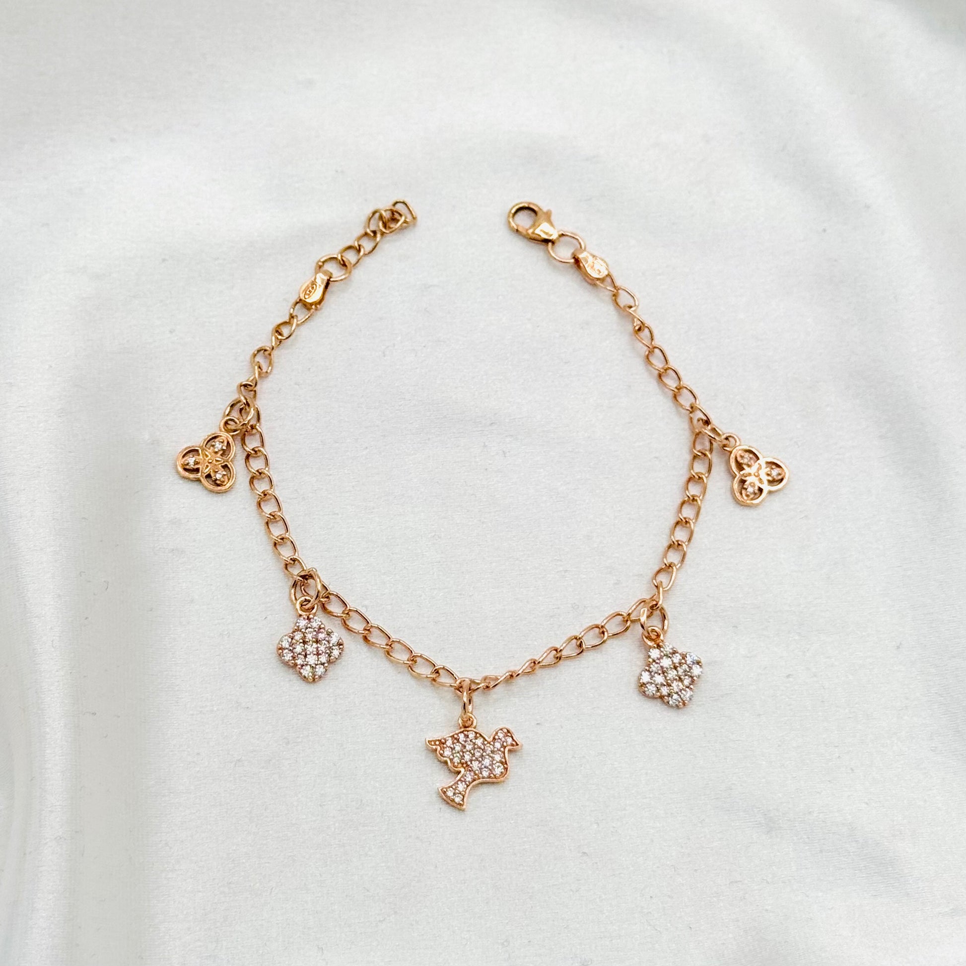 This rose gold dangler bracelet in sterling silver features delicate clover and bird charms, blending graceful symbolism with elegant design. Its refined finish and charming details make it a sophisticated accessory that adds a subtle, meaningful touch to any ensemble.