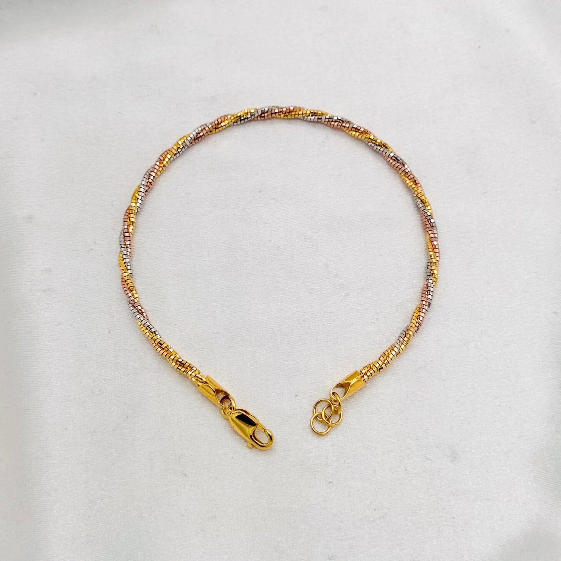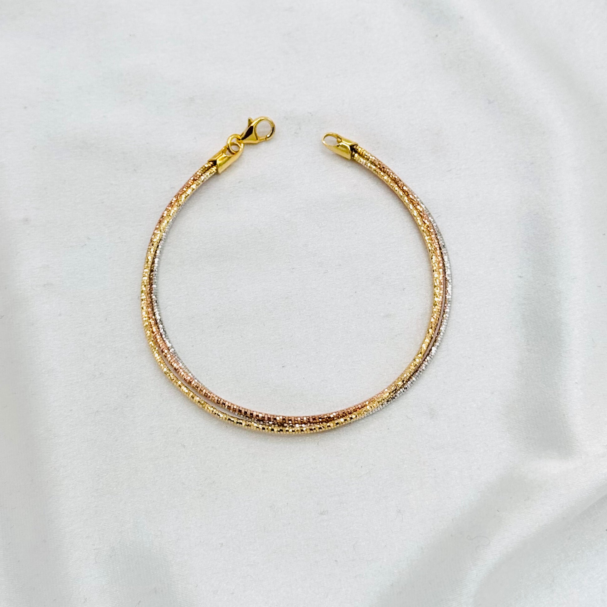 This bangle-style bracelet features a harmonious blend of gold, rose gold, and silver tones, expertly crafted in sterling silver. Its tricolour design adds a modern yet timeless elegance, making it a versatile piece that complements any refined wardrobe with subtle sophistication.
