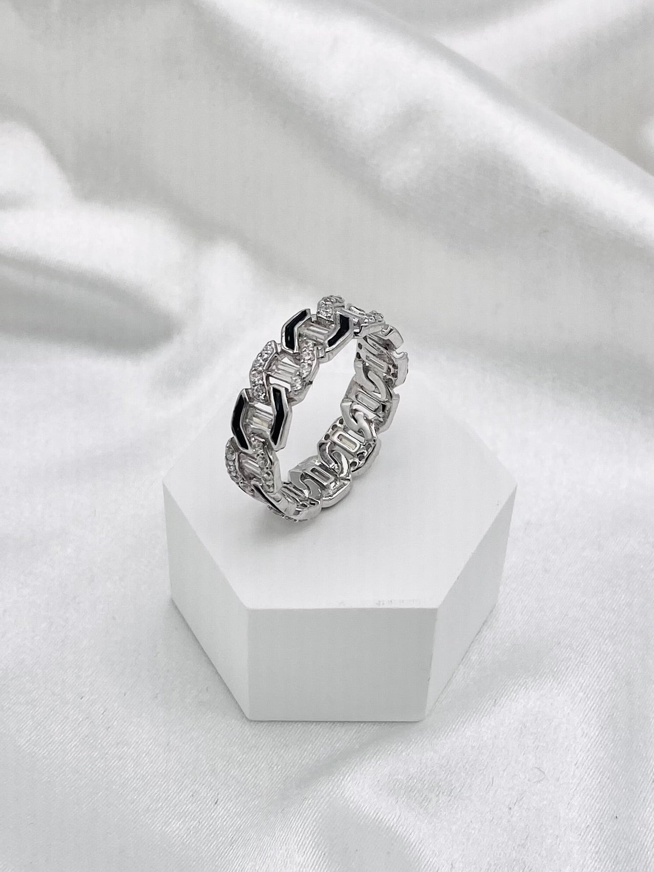 Indulge in luxury with this Unisex Cuban Link Iced-Out Moissanite Band. Made with a stunning Cuban link design in sterling silver, this band is completed with dazzling iced-out moissanite stones. Elevate any outfit with this elegant and stylish accessory.