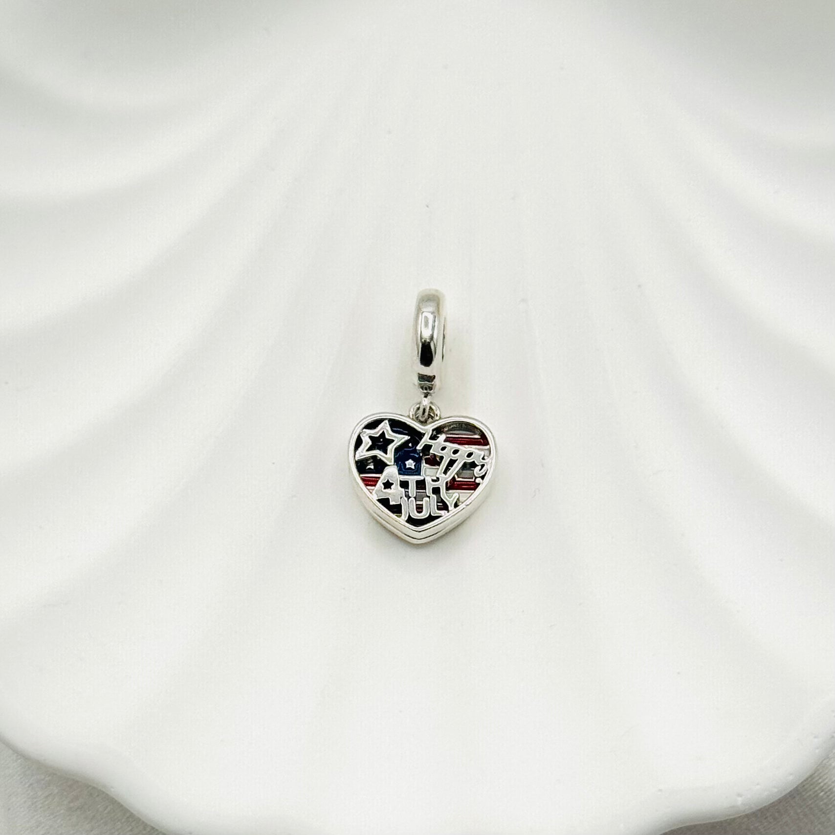 Celebrate Independence Day with elegance using this American 4th July heart charm crafted from 925 sterling silver. Its refined design subtly honors the holiday while adding a touch of sophistication to your bracelet collection. Perfect for those who appreciate meaningful yet graceful jewelry, this charm combines patriotic spirit with timeless style.