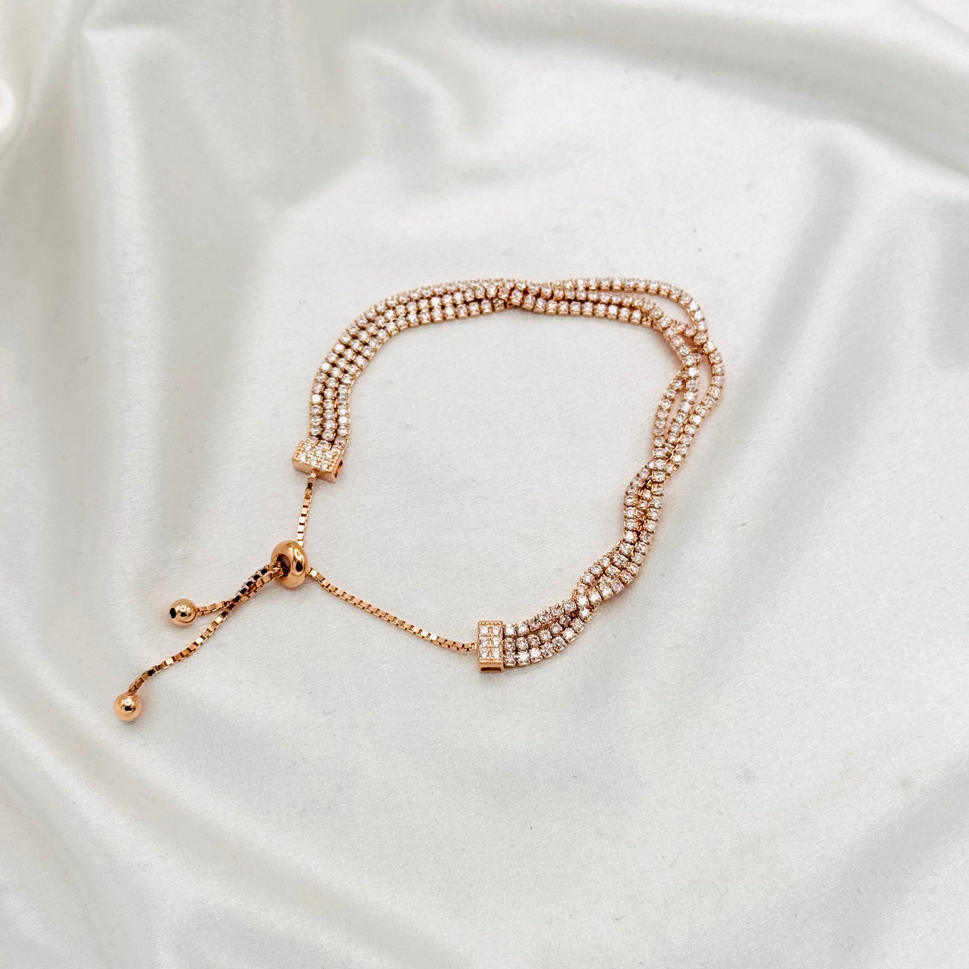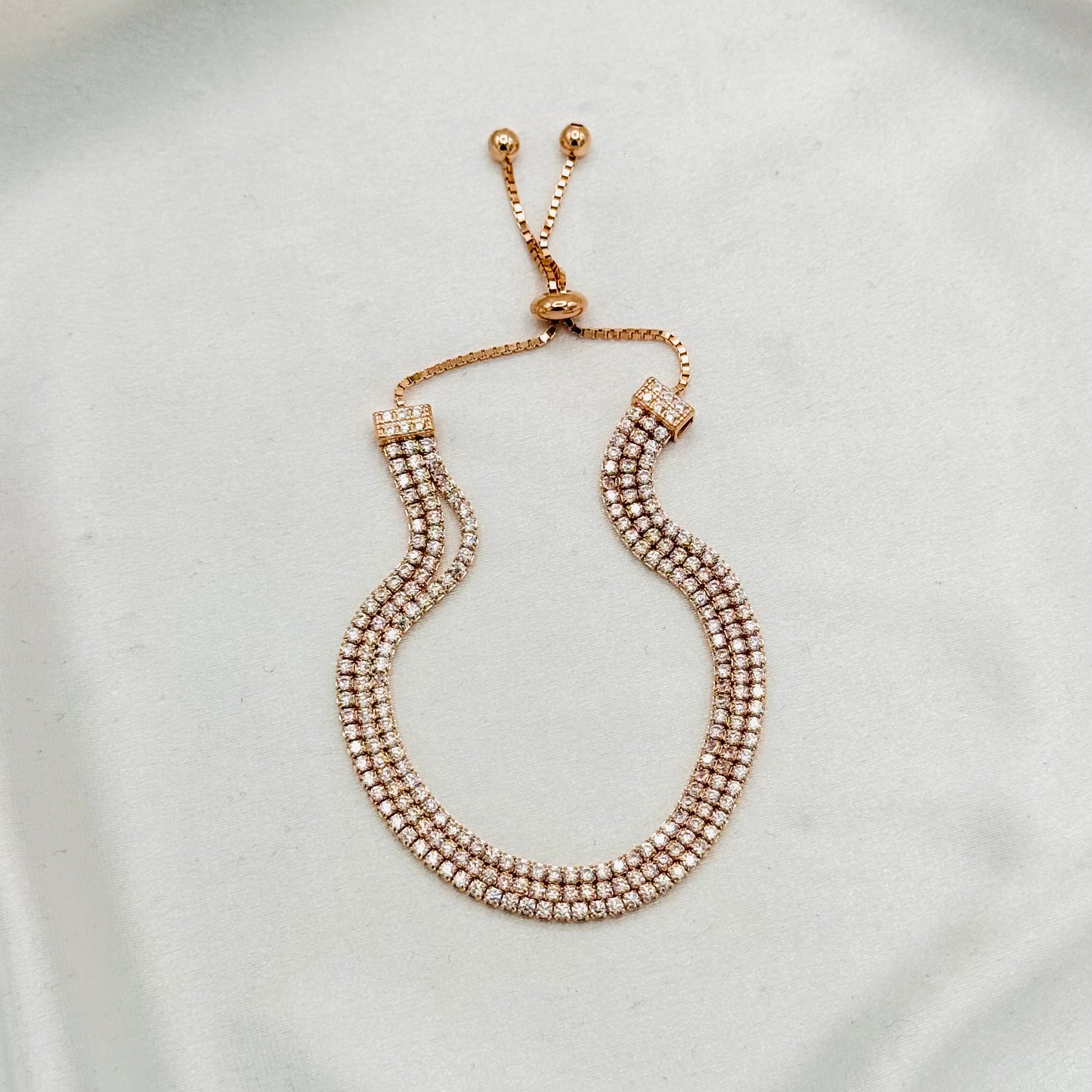This luxurious rose gold tennis bracelet features a triple-layer design crafted with AAA-quality stones set in sterling silver. Its layered construction enhances sparkle and depth, making it a stunning accessory that adds elegance and sophistication to any ensemble.