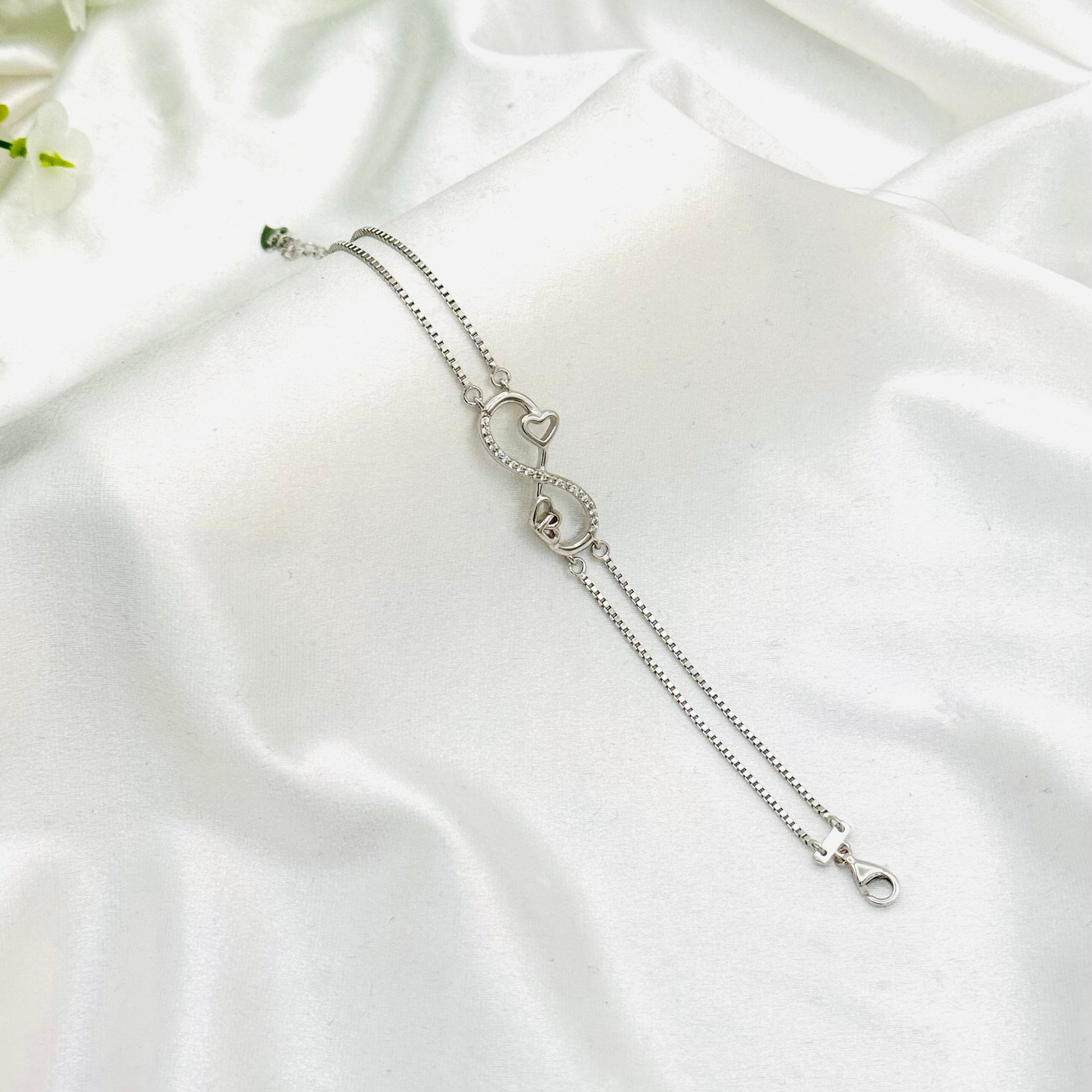 This Italian sterling silver 925 bracelet features a sophisticated chain design intertwined with infinity symbols, symbolizing endless elegance. Set with brilliant moissanite stones, its sturdy craftsmanship and intricate detailing create a striking accessory that combines strength with timeless beauty.
