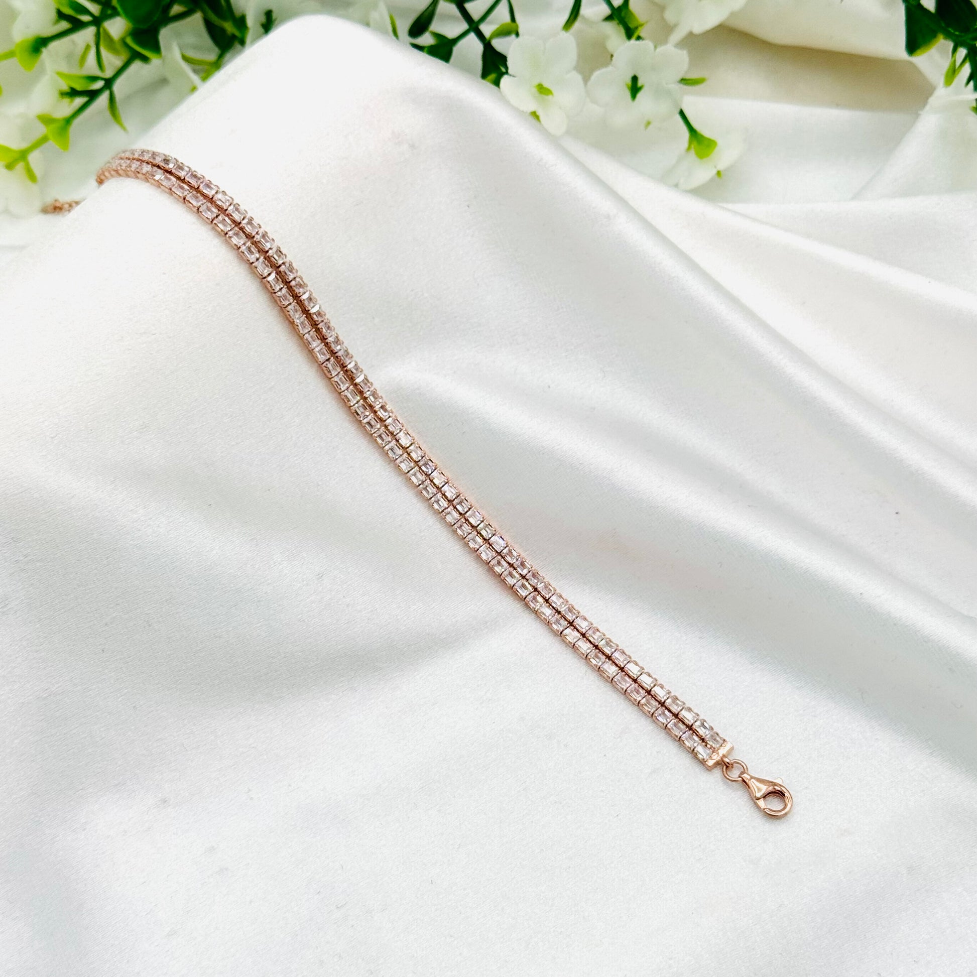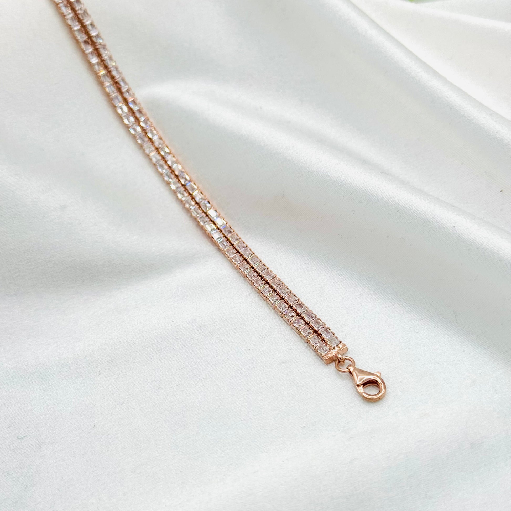This women’s tennis bracelet features a stunning double-layer design plated in rose gold bracelet in sterling silver. Its elegant row of sparkling stones offers refined brilliance, while the quality craftsmanship ensures lasting beauty. Perfect for adding a sophisticated and modern touch to any outfit.